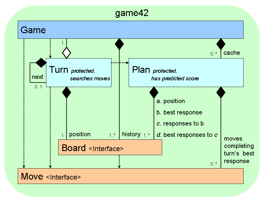 In 2000, Paul translated his C++ game engine into the existing Java Game42 implementation. It is easy to reuse the Game42 engine because all of the complex AlphaBeta search optimizations are encapsulated within protected classes Turn and Plan. Turn searches possible moves looking way ahead and recording the best Plans for consecutive turns. Recorded Plans are cached and reused by Game for optimizing future searches.
